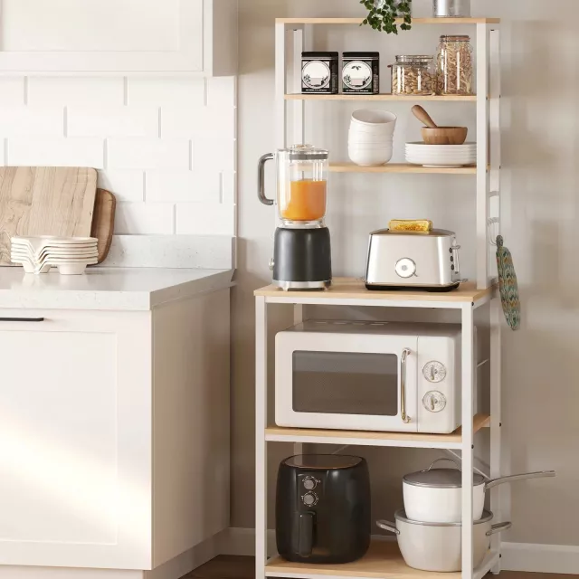 This rack features six spacious shelves crafted from durable particleboard supported by a strong steel frame. The middle worktop holds up to 85 lb, making it perfect for a microwave, espresso machine, or other larger appliances. Upper shelves support 23 lb each—ideal for spices, décor, or small essentials—while the lower shelves hold up to 80 lb each to store heavier cookware or bags of ingredients.