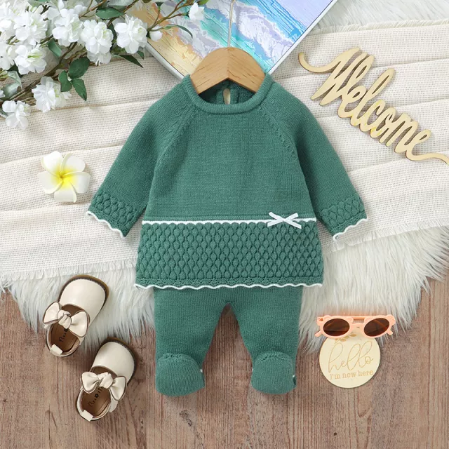 This outfit is ideal for cooler days in spring, fall, and winter, keeping your baby snug whether you’re enjoying a stroll, taking photos, or relaxing at home. The pullover style and stretchy worsted-knit fabric make dressing quick and fuss-free, while the foot-wrapping trousers help keep tiny toes warm without the need for extra socks.