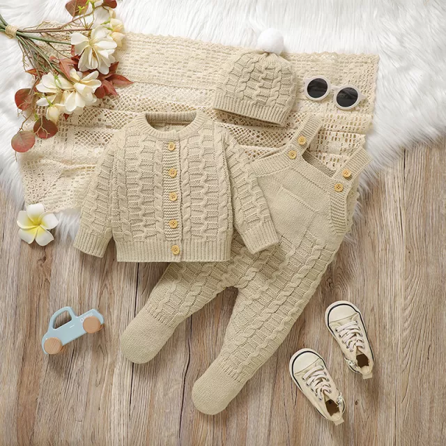 What are the product’s basic features? This set includes a soft long-sleeve cardigan (about 19.7–22 in depending on size), a sleeveless jumpsuit, and a matching hat—all crafted with durable acrylic knit. The fabric offers warmth without heaviness and stays gentle on sensitive newborn skin.