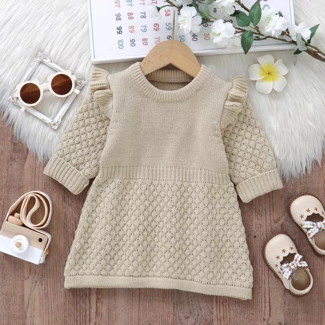 Dress your baby girl in cozy charm with this knitted sweater dress, designed to keep her warm, comfortable, and irresistibly cute during autumn and winter days. Made with soft, breathable polyester and acrylic blend, this long-sleeve dress offers gentle warmth without feeling heavy—perfect for babies from 6 months to 3 years. Its solid color design, pretty ruffles, and classic A-line silhouette create a princess-style look that’s ideal for both everyday wear and special outings.