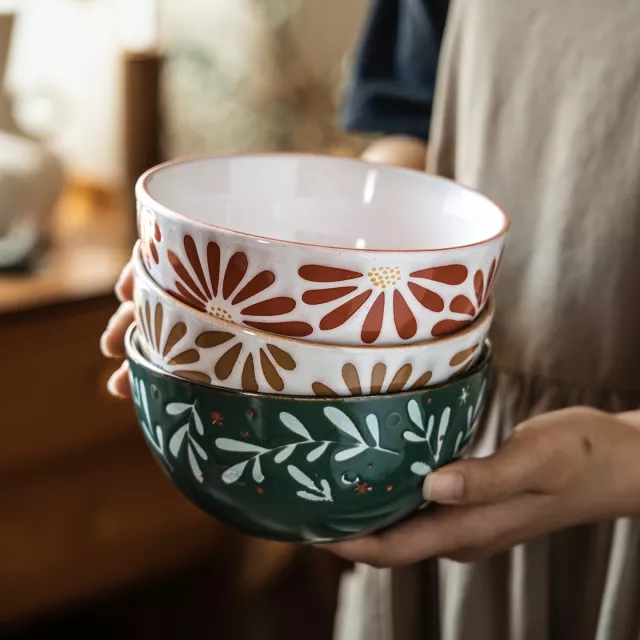 The charming floral design makes each bowl unique, offering an inviting, rustic look that pairs wonderfully with a variety of home décor styles. Whether you’re enjoying a comforting bowl of soup, fresh salad, or your favorite noodle dish, these bowls elevate your dining experience and add a layer of sophistication to even the simplest meals.